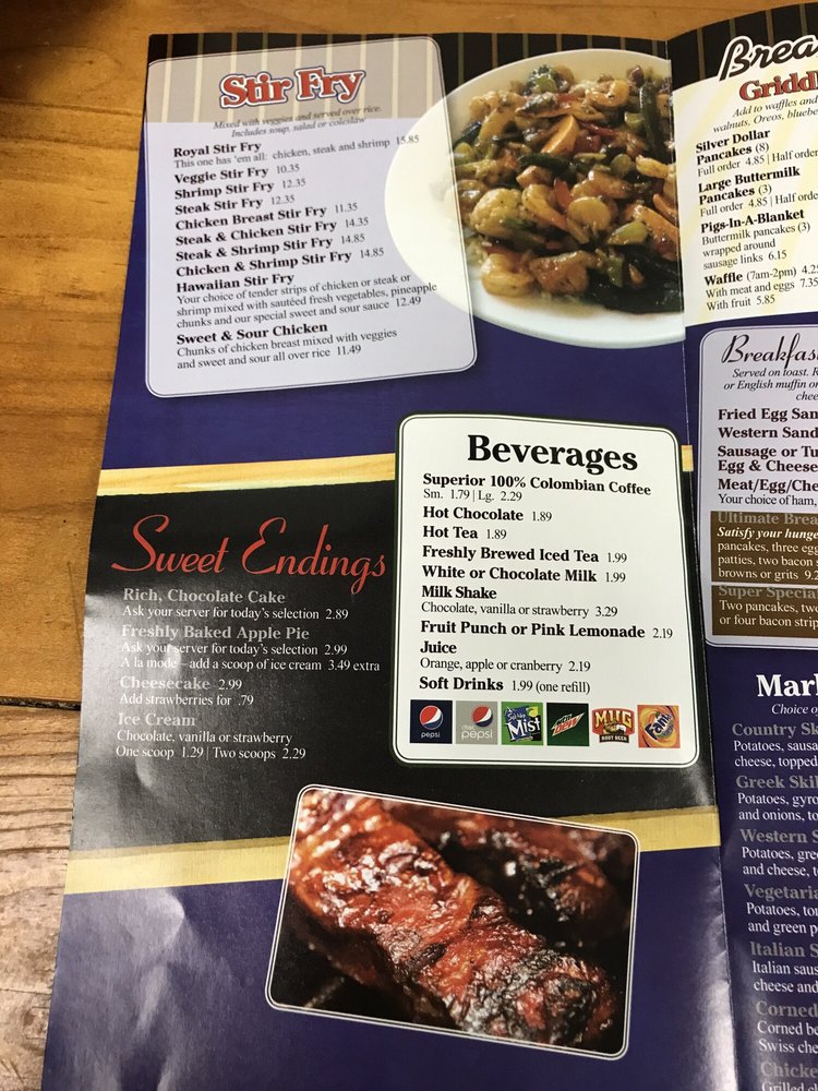 Hash browns, corned beef, green peppers, onions and Swiss cheese, topped with 2 eggs.