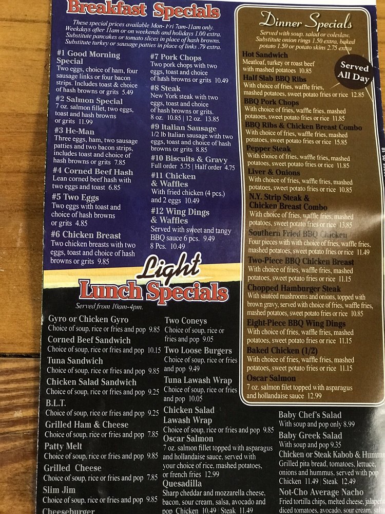 3 eggs, ham, 2 sausage patties and 2 bacon strips, includes toast and choice of hash browns or grits.