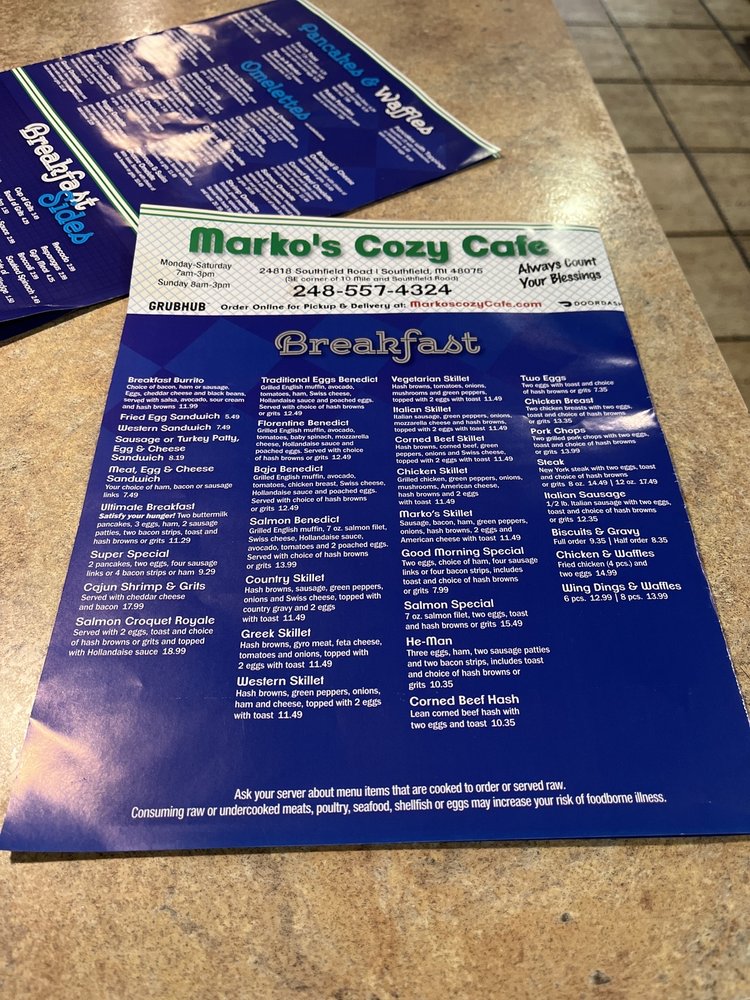 Welcome to Marko's Cozy Cafe, a charming spot in Southfield, MI that offers a wide range of breakfast specials, sandwiches, and omelettes. With a cozy and welcoming atmosphere, this cafe is perfect for a quick bite or a leisurely meal. The Good Morning Special, Salmon Special, and He Man breakfast options are sure to satisfy any appetite, while the variety of omelettes like the Santa Fe and Greek offer flavorful choices for vegetarians. Customers rave about the friendly service and delicious food, with praises for their eggs Benedict and crispy bacon. The small but bustling cafe exudes a family feel, where regulars are treated like old friends. Whether you're dining in or grabbing takeout, Marko's Cozy Cafe promises a delightful experience with every visit.